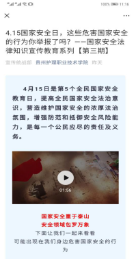 从4月13日起,在学院官方网站和微信公众号开展了国家安全法律知识宣传教育系列专题,截至4月17日,已推出五期相关内容。