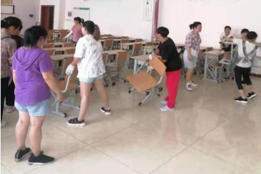 宿管、保洁正在搬运课桌椅